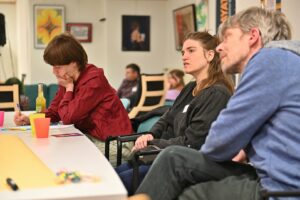 Drei Personen sitzen nebeneinander, die mittlere spricht. Eine Person steht vor einer Präsentation und spricht Mehrere Personen sitzen an zwei verschiedenen Tischen und diskutieren. Drei Personen stehen zusammen und reden miteinander, im Hintergrund sind weitere Personen. Mehrere Personen sitzen in einem Raum zusammen an einem Tisch, vor ihnen steht eine weitere Person an einer Pinnwand und redet. Mehrere Personen sitzen zusammen an einem Tisch, am Ende des Tisches steht eine Pinnwand mit Notizen. Vier Personen sitzen zusammen an einem Tisch und reden miteinander. Eine Person steht vor einer Präsentation und spricht zu einem Publikum. Ein Publikum sitzt auf Stühlen vor einer Präsentation. Eine Person sitzt vor einer beschrifteten Pinnwand und redet, während andere zuhören.